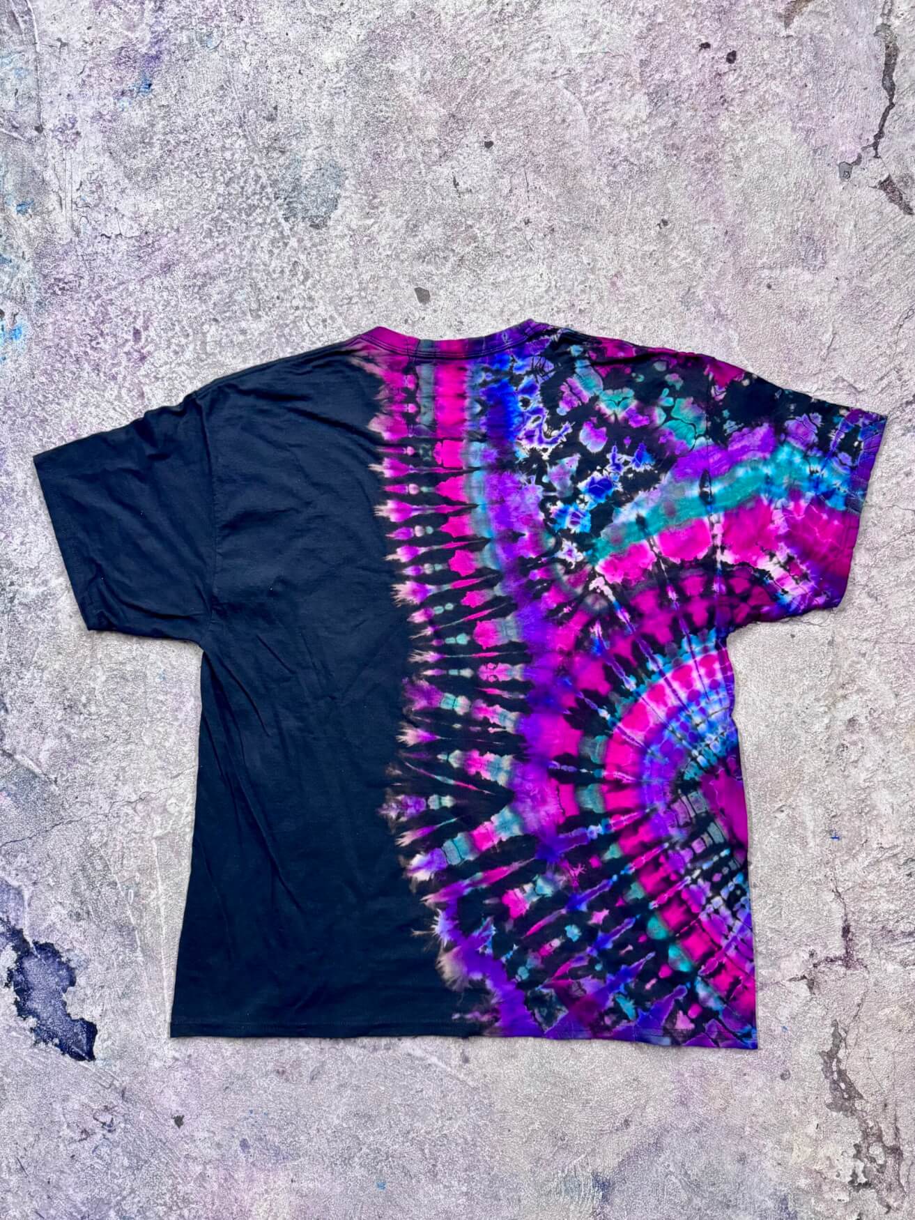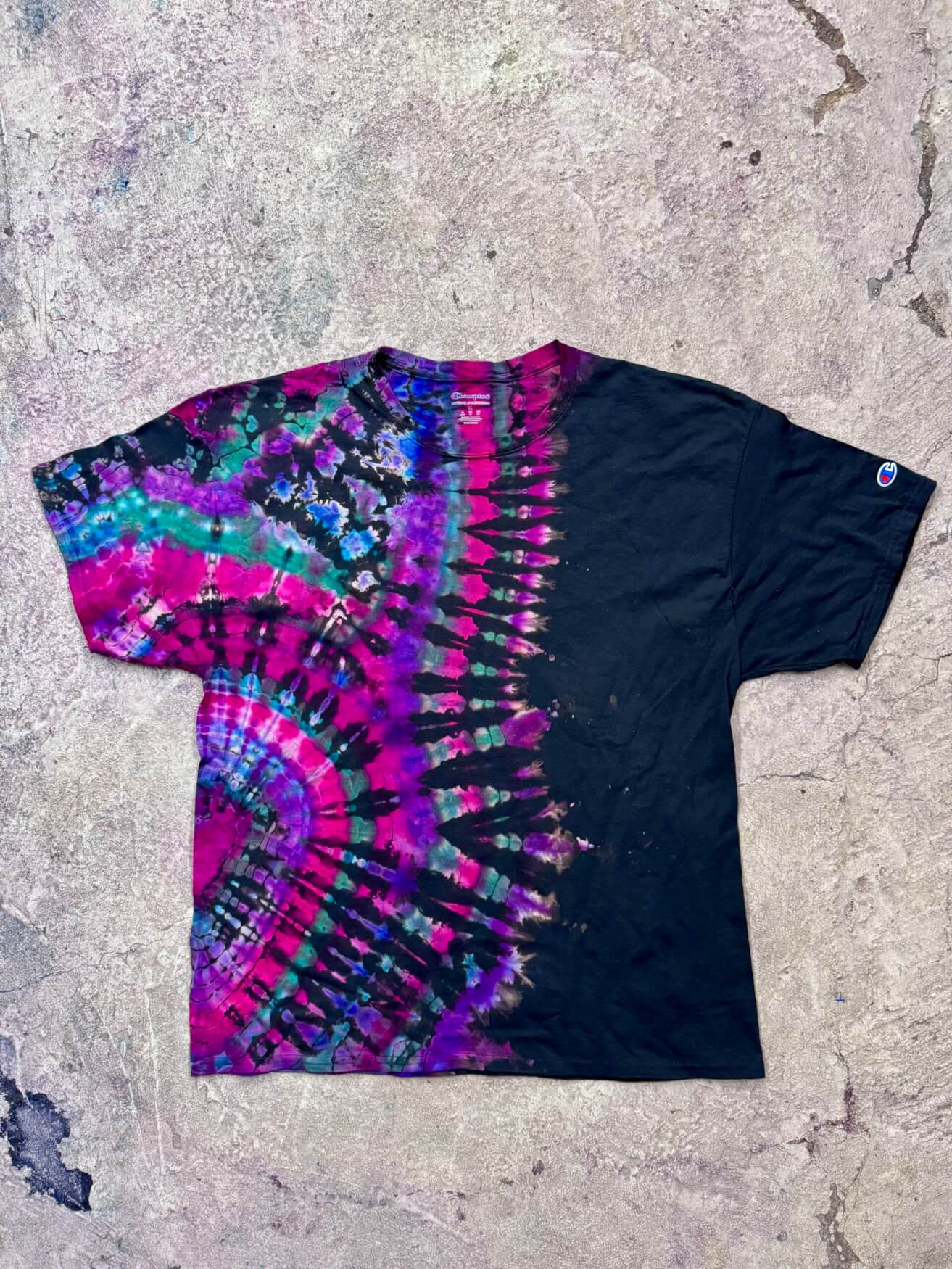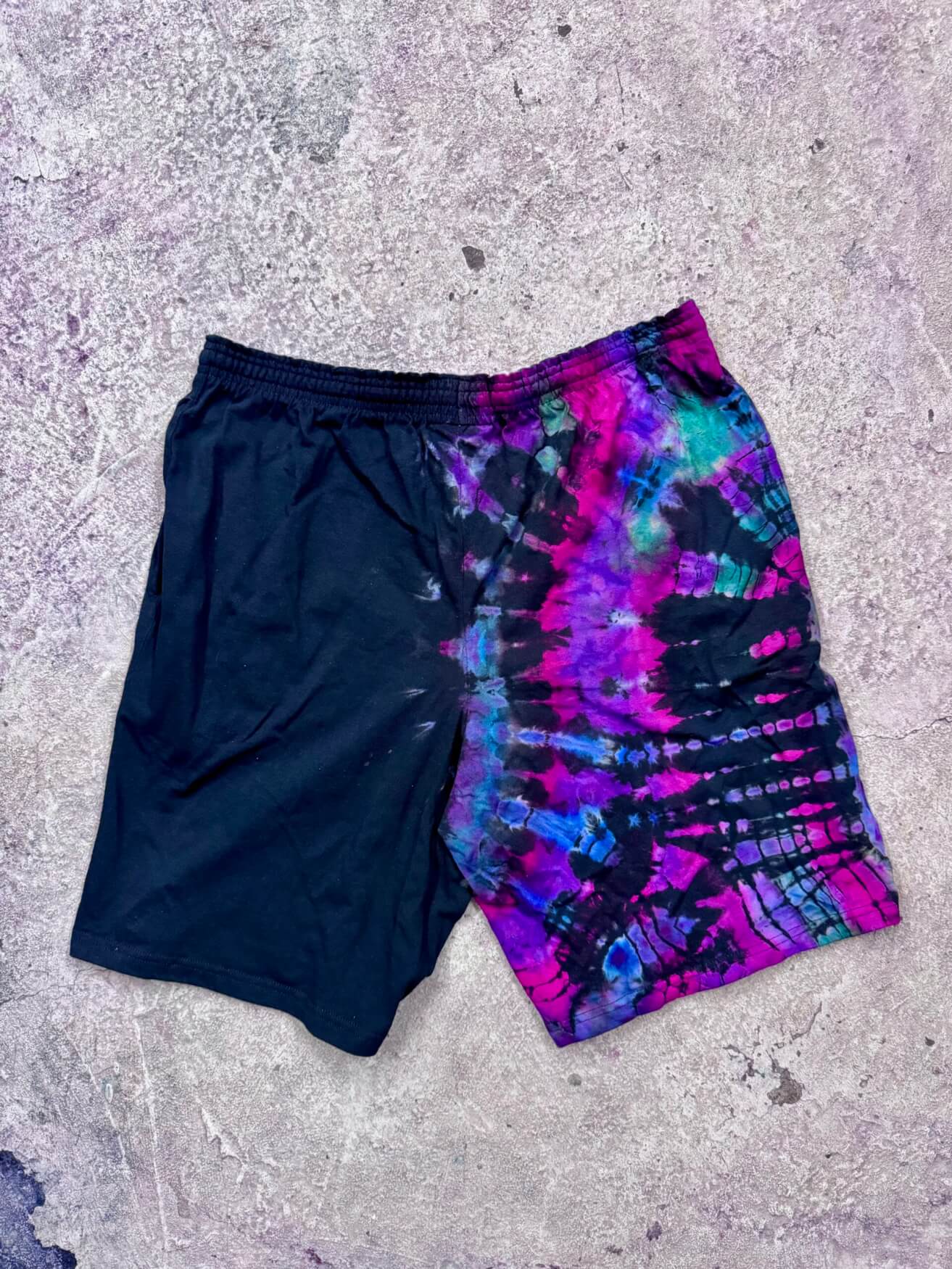This is an XL Shirt/Shorts reverse dye set by Massachusetts based dye artist Alex Rubin, aka “Dyes by Roobs”. All sets are reverse dyed on Champion shirts and shorts in matching sizes. Reverse dyes start with black clothing, they are tied with sinew, the color is then removed with “Out White Bright”, they are then washed clean, and then dyed with fiber reactive dyes and ice, to create the unique and darker feel that comes with Roobs reverse dyed clothing.